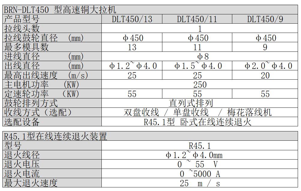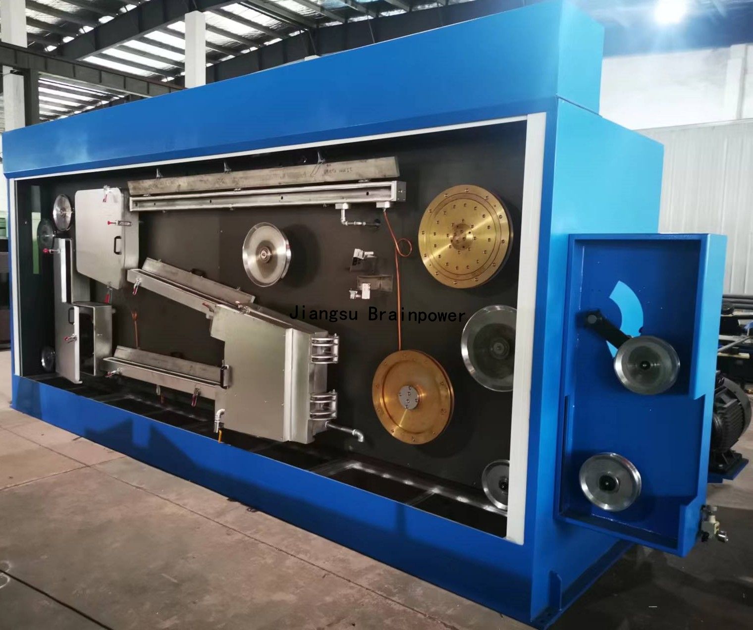 本机采用全新技术、主机整体式铸铁箱体、高精度的磨齿齿轮和NSK轴承,大大提高机器运行精度和使用寿命,单列式鼓轮布置、快速换模、浸油式拉线润滑和卧式退火装置便于操作,保证线材的质量. 双盘收线装置气压控制,反应速度快,无污染,工作稳定,保证在拉线不停机的条件下进行换盘,有较高的生产率。本机适用500/630收线盘,满足线缆行业各种设备的需求